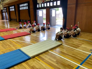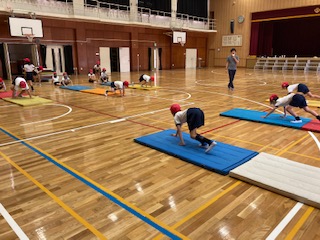 マット運動 その1 公開日 2021/05/25 更新日 2021/05/25 3年生 自分たちでマットの準備をしているのは3年生です。 いぬ歩き、うま歩き、うざぎ跳びなど、 いろんな動物になって準備運動をします。 いいね(0)