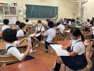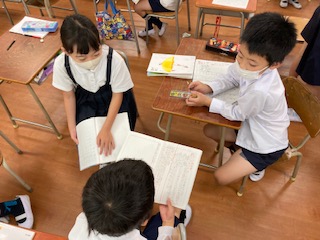 聞いたことをメモに取り、 その内容を確認し合っています。 3年生の国語の教科書は、黄色い傘。