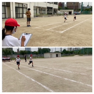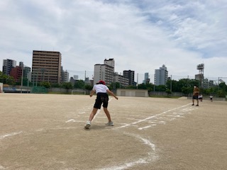 「どりやあ〜!」の声。 ソフトボール投げで、つい出ちゃったようです。 あ。 線、越えてるよ!