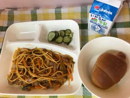 今日の給食は、「黒糖パン1/2、牛乳、スパゲッティミートソース、きゅうりのピクルス」でした。