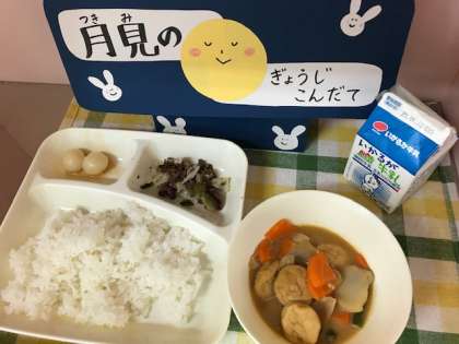 おだんごがあるので、もうお気づきでしょうか?今日の給食は、お月見の行事献立でした。今年の十五夜は9月21日なので、少し早めのお月見です♪