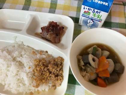 今日の給食は、「ごはん、牛乳、豚肉のねぎじょうゆ焼き、ふきよせ煮、ツナ大豆そぼろ」でした。