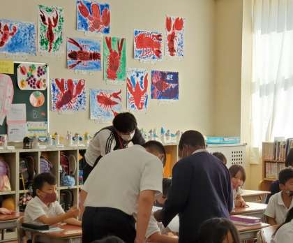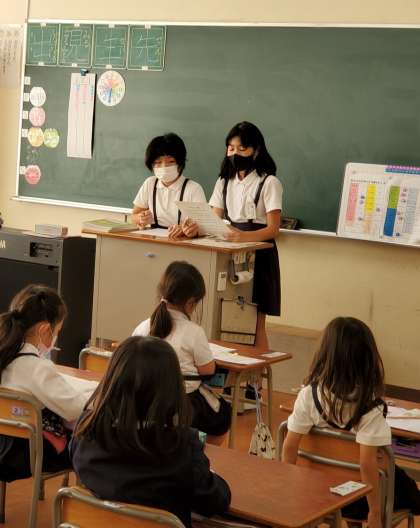 つめがきちんと切れているか、一人ひとりチェックします。つめチェックの前には 「つめについてのお話」を発表しました。