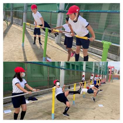 鉄棒 公開日 2021/11/04 更新日 2021/11/04 5年生 前回りや逆上がりに取り組んでいます。 意外とできない逆上がり。 がんばればがんばるほど、筋肉疲労とマメとのたたかい。 残りの時間は、おおなわとび大会に向けて特訓です! いいね(0)