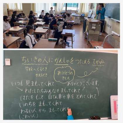 てがみを かこう 公開日 2021/11/10 更新日 2021/11/10 1年生 地域の人に感謝を伝える手紙を書くために、 みんなで意見を出し合っています。 黒板に記された文字は、全て子どもたちから出た意見です。 わたしたちの安全を守ってくれて、ありがとうございます! いいね(0)