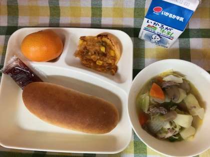 今日の給食は、「コッペパン、牛乳、豚肉と野菜のスープ煮、変わりピザ、みかん、いちごジャム」でした。