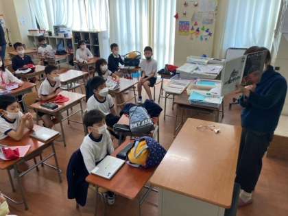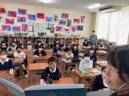 読書ボランティア 公開日 2021/11/16 更新日 2021/11/16 お知らせ 1年生 2年生 3年生 毎回、どこかのクラスに校長先生が現れます。 今日は、1年生でした。 「おじさんが、本を読むよ〜。」 「おじさんじゃない! こうちょうせんせいー!!」 いいね(0)