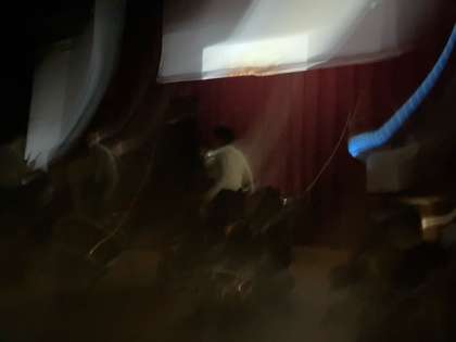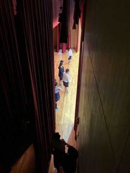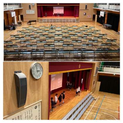 上から。 公開日 2021/11/23 更新日 2021/11/23 4年生 4年生の様子です。 6時間目です。 1・2枚目は、2階から。 3枚目の真っ暗な1枚は、 暗転の間に、子どもたちで太鼓の準備をしているところです。 うっすらと子どもたちが見えるので、そこも見て見てポイントです。 ドローン撮影ではなく、 階段を上がって、ぶるぶる震えながらの撮影でした。 いいね(0)