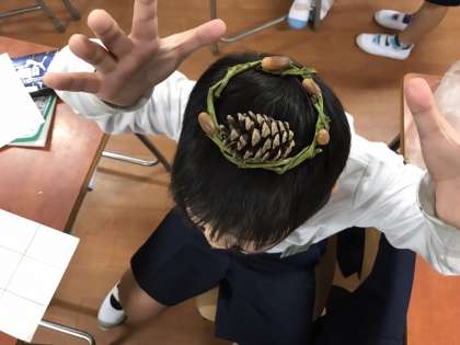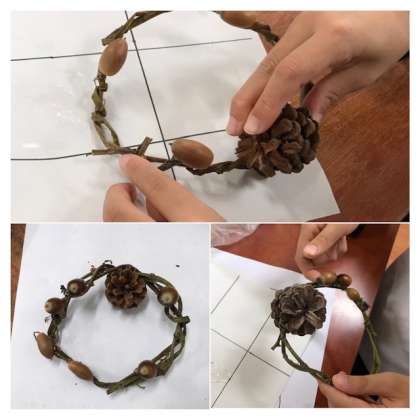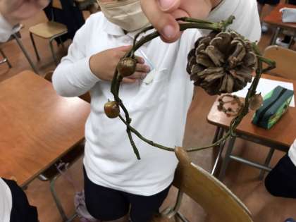 サツマイモ掘りでゲットしたツルと、秋の遠足の長居公園で拾ったどんぐりや松ぼっくりを使って、オリジナルリースを作りました。