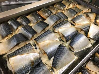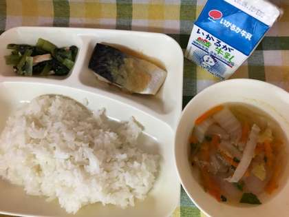 今日の給食は、「ごはん、牛乳、さばのみぞれかけ、すまし汁、こまつなの煮びたし」でした。