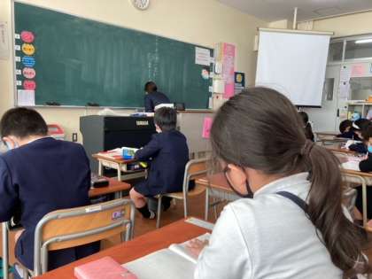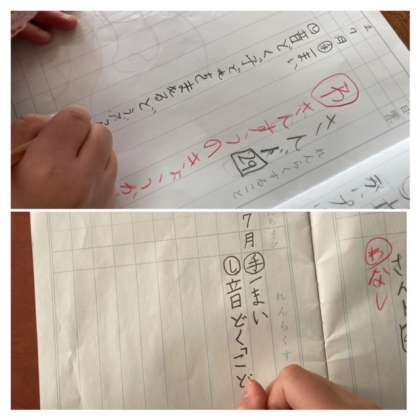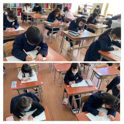 先生が記す黒板の文字を、連絡帳に書き写しています。