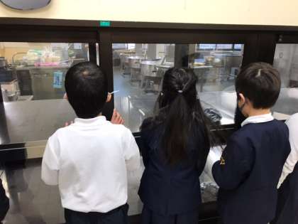 給食が作られている様子を見て、子どもたちから「おいしそう!」「すご〜い」という声があがっていました。