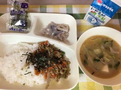 今日の給食は「鷄ごぼうごはん、みそ汁、焼きれんこん、牛乳」です。