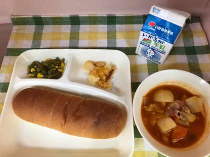 昨日の給食は、「レーズンパン、牛乳、ケチャップ煮、さんどまめとコーンのソテー、りんごのクラフティ」でした。