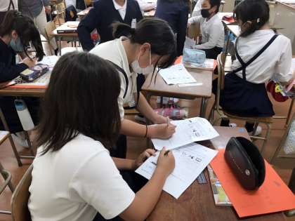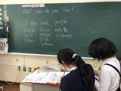 友だちが何色が好きか、英語でインタビューをしています。