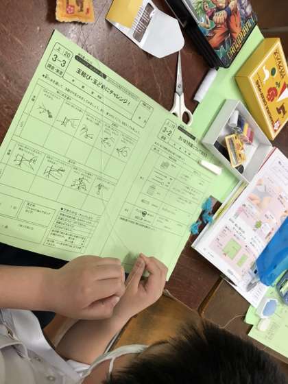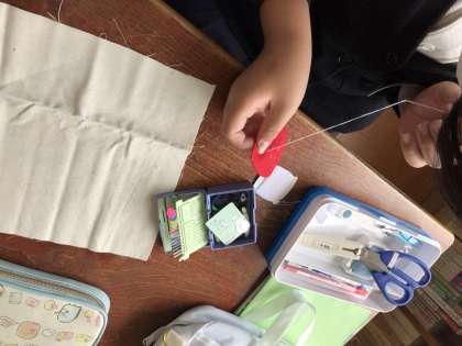 初めての裁縫道具を使っています。すごい集中力です。