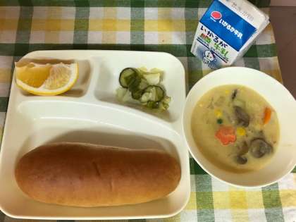 5月13日の給食は、「黒糖パン、牛乳、コーンクリームシチュー、キャベツときゅうりのサラダ、かわちばんかん」でした。