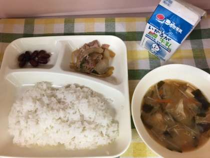 9月5日(月)給食は、「ごはん、豚肉の甘辛焼き、みそ汁、金時豆の煮もの」でした。