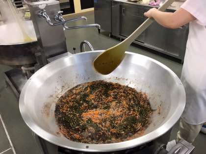 給食のジューシーでは、豚ひき肉、にんじん、もずく、切りこんぶ、豚骨スープを使っています。