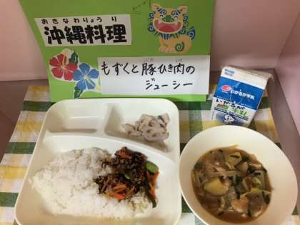 10月17日の給食は、「もずくと豚ひき肉のジューシー、さつまいものみそ汁、焼きれんこん、牛乳」でした。