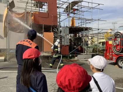 訓練の様子を見せて頂きました。ものすごい勢いの水で消火します。