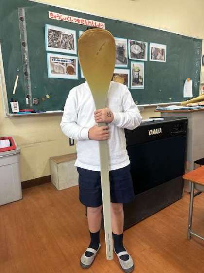 「こんな大きなしゃもじでお鍋を混ぜてるなんて、給食調理員さんたちすごい!!!」