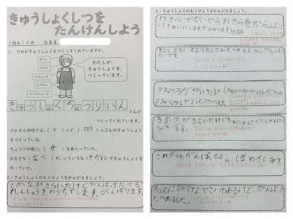 先日、「食」の学習で、給食室や給食調理員さんのお仕事について学習しました。