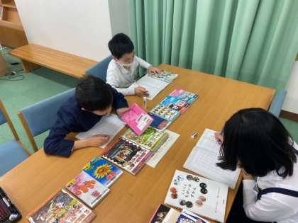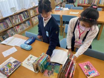 図書室の本がきれいに仲間分けされているのは、本に貼られているラベルが関係しているということを国語科で学習しました。今日は図書室でそのラベルを確認!これから見つけたい本があるときは、このラベルから探すことができますね。