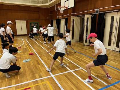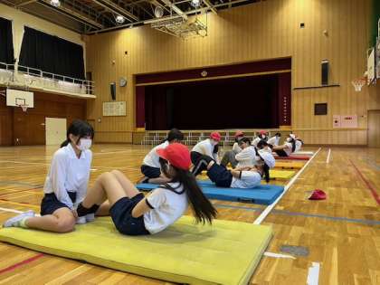 体力測定真っ只中。それぞれの限界に挑戦です!これまでソフトボール投げ、50m走、反復横跳び、上体起こし、立ち幅跳びを測定しました。真剣に取り組む姿はさすが6年生。
