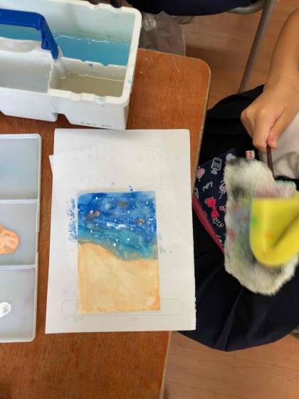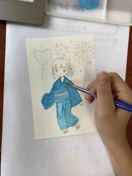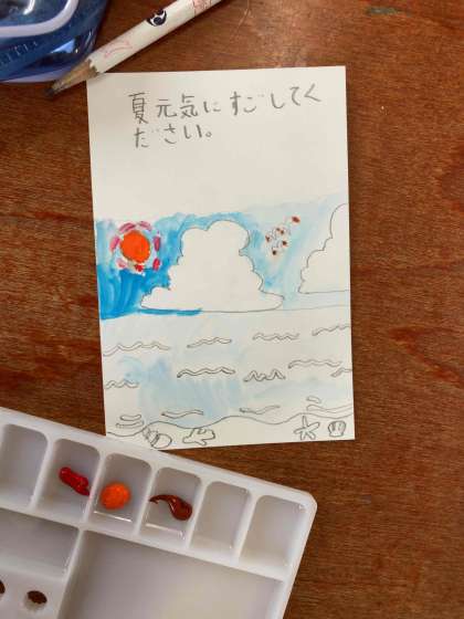 今日は葉書に夏の絵を描いて絵の具で色を塗りました。