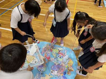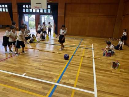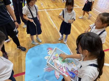 1学期最後の日、栄小フェスティバルで実施した「さかなつり」と「ぼうりんぐ」を1年生全員でもう一度やりました。