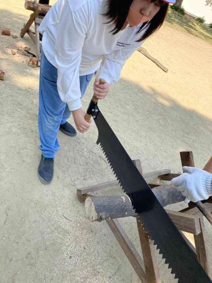 薪割り体験です!二人で息を合わせてみんなで押したり引いたり??