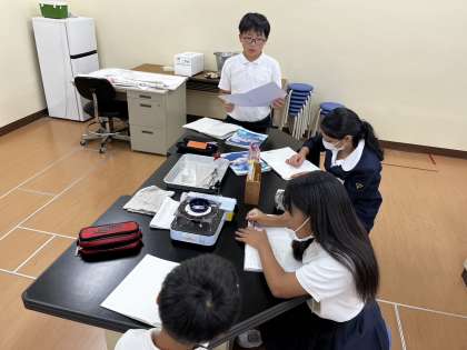 5つの水溶液があり、それぞれの特徴を調べています。においをかいだり、見た目を比べたり、蒸発皿で蒸発させたりしました。ツンとするにおいのものがあったり、蒸発させると白い固体が出てきたりと水溶液によって違いがあることがわかりました。ツンとする匂いは危険な匂いです。直接かいだり、触ったりしないようにしましょうね。