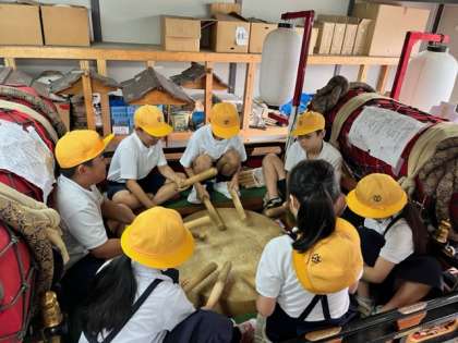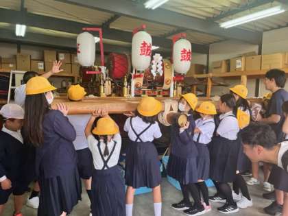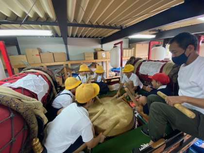 歴史について教えて頂いたり、おみこしに乗せて頂き、太鼓をたたいたりしました。太鼓の音はとても迫力があって、みんな楽しそうに演奏できていました。