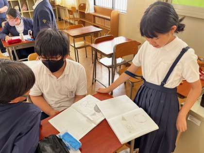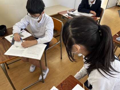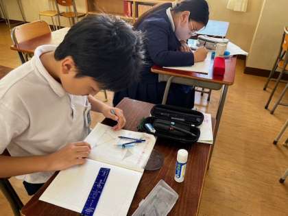 コンパスや分度器を使って拡大図や縮図をかいています。これまで学習した比や、合同な図形のかき方を応用して拡大図、縮図のかき方を考えました。どんな方法があるのか友だちと意見を交流し、理解を深めることができました。