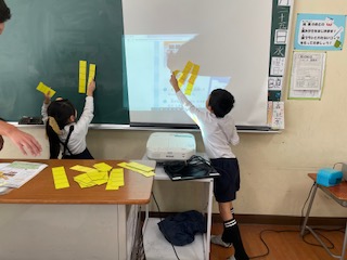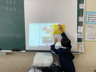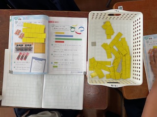 電気!ロッカー!掲示物!など、たくさんのまとまりを見つけ、ブロックを使って自分たちでかけ算の式にすることができました。