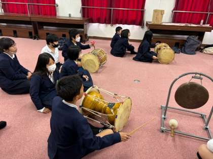 学習発表会で練習した和太鼓とはまた違った音色で、楽しく体験できていました。