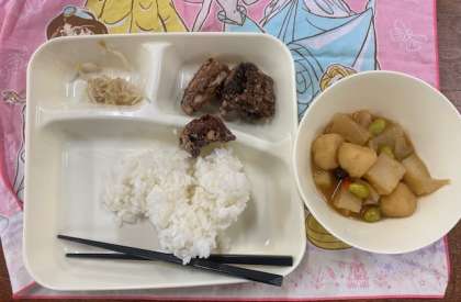 今日の献立:くじらのたつたあげ、まるてんと野菜の煮もの、もやしのしょうがづけ、ごはん、牛乳