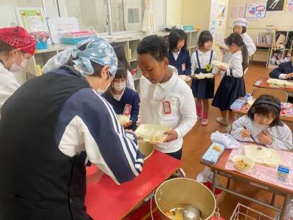 一年生は、「え!くじら!?あのくじら!?どんな味!?」と最初は食べるのにドキドキしましたが、食べてみると‥「おいしい!おかわり!」とおかわりには行列ができました。