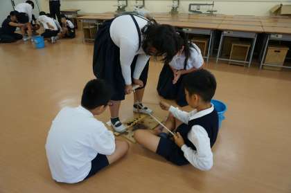 米のもみを取る体験や火をおこす体験を行い、弥生時代の
