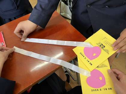 そして、中村先生から6年間の成長の記録をいただきました。白いリボンの長さは6年間で伸びた身長の長さです。みんな大きくなりましたねー!