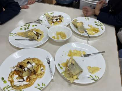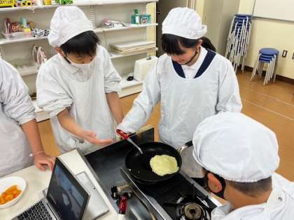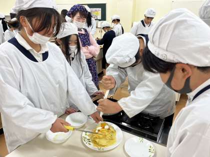 卒業まであと10日を切りました。調理実習も最後です。今回は、クレープを作りました。生地を薄く焼くのに苦労しましたが、班で協力してだんだんと上手に焼けるようになりました。盛り付けはそれぞれフルーツをつつんだり、上に乗せたり、班で1つの大きなミルクレープを作ったりとバラエティーにとんでいました。