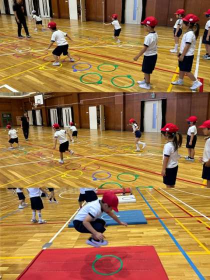 体育では置かれている輪っかに合わせて、けんけんとパーをして体を動かしました!