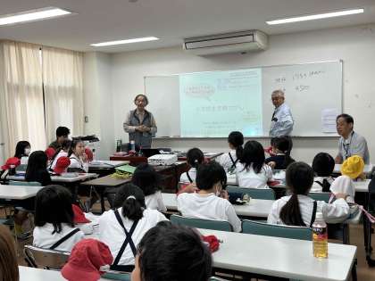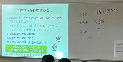 大阪市立環境科学研究センターの方々に来ていただき、生き物探しの授業をしていただきます。
