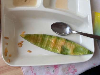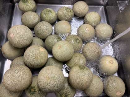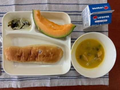今日の献立:鶏肉とかぼちゃのシチュー、ミックス海そうのサラダ、クインシーメロン、おさつパン、牛乳