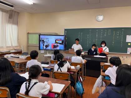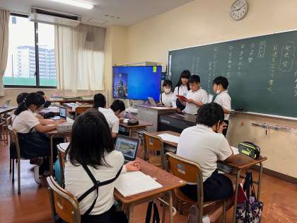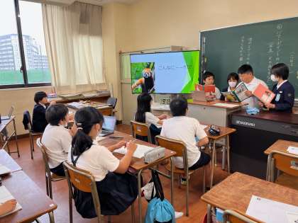 国語では「地域のみりょくを伝えよう」ということで、グループに分かれて栄の魅力、大阪の魅力をプレゼンしました。パワーポイントは初めて使いましたが、写真や文字などを効果的に使って発表することができました。