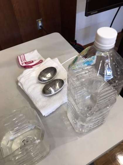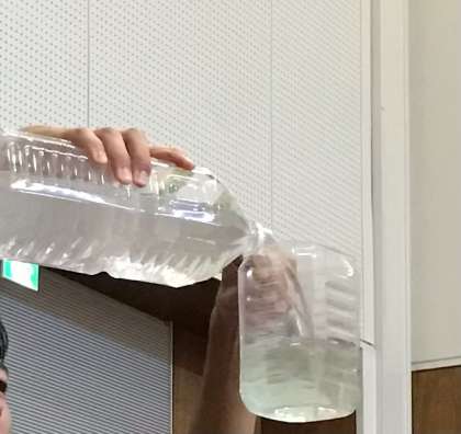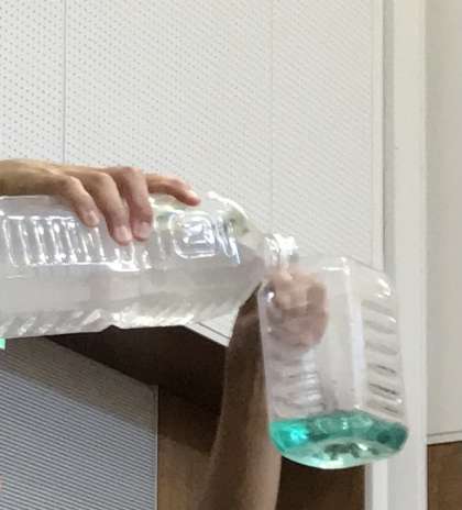 わかりやすいように色をつけた水にオゾン水を入れます。