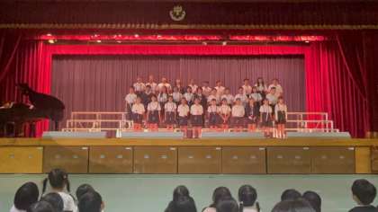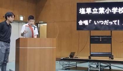 栄小代表の5年生はたくさんのお客さんの前でリコーダー奏と合唱をしました。緊張でリコーダーを持つ手が震えた子もいましたが、やさしくきれいな音色を響かせることができました。