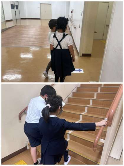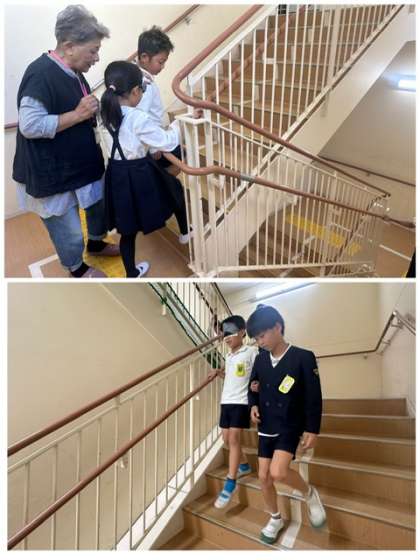2人ペアになり、1人はアイマスクをつけて目が見えない状態で、校内を歩きました。