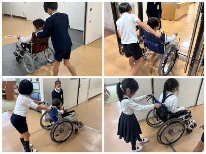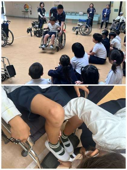 実際に自分が乗ったり、車いすをおしたりする体験は初めてで、みんな真剣に説明を聞いていました。